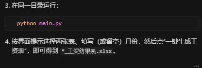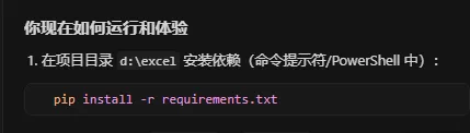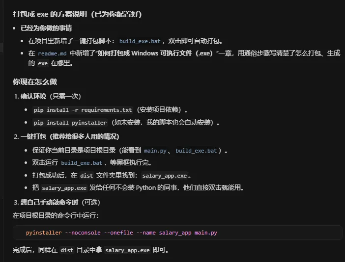 经过前面的步骤,我们已经成功实现了用 Python 处理 Excel 表格的功能 。但如果我们想要将这个程序分享给没有 Python 环境的同事,该怎么办呢?这时候,我们就需要将 Python 脚本打包成 exe 程序 。不会代码怎么办呢,简单,告诉Cursor:”将代码打包成可执行的exe文件。”接着cursor有问题会问你,然后回答即可。然后它就会自动帮用户打包,同时还会生成文档告诉你如何操作。