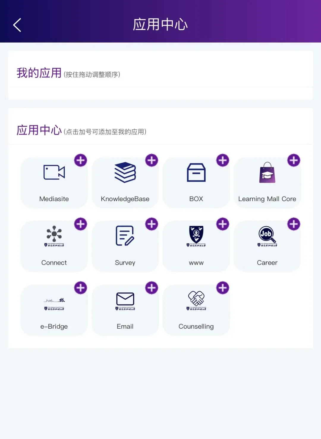 应用中心包括如e-bridge、lmo、box、utalk、gradescope、library等多个常用学习网站的登陆入口,还含有心理咨询、一站式等日常生活辅助网站的登录入口。