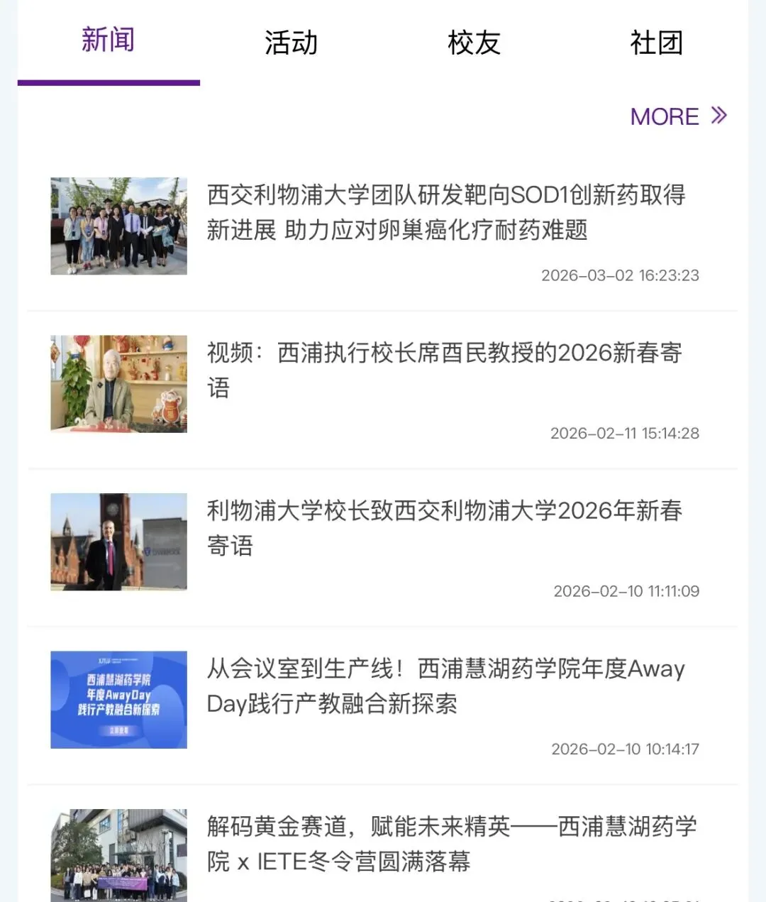 分为新闻、活动、校友、社团四个板块。小伙伴们可以在这里及时了解学校的新闻以及学校举办的各类活动,丰富校园生活。