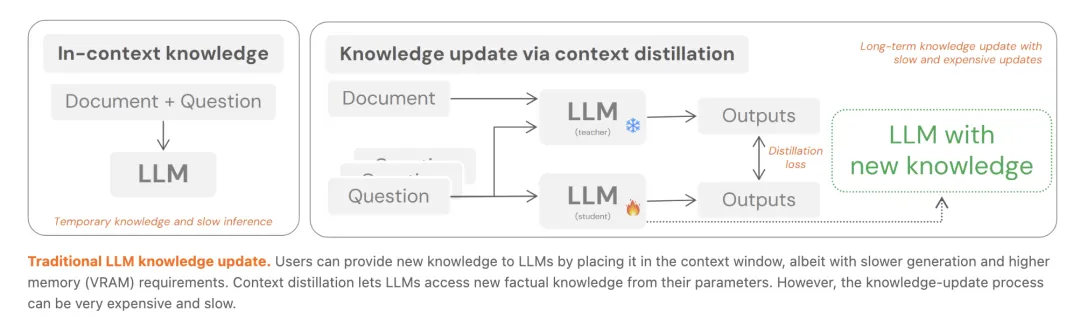 传统上下文蒸馏能够将文档知识内化为模型参数,其核心优化目标是通过最小化 KL 散度来实现知识转移:
