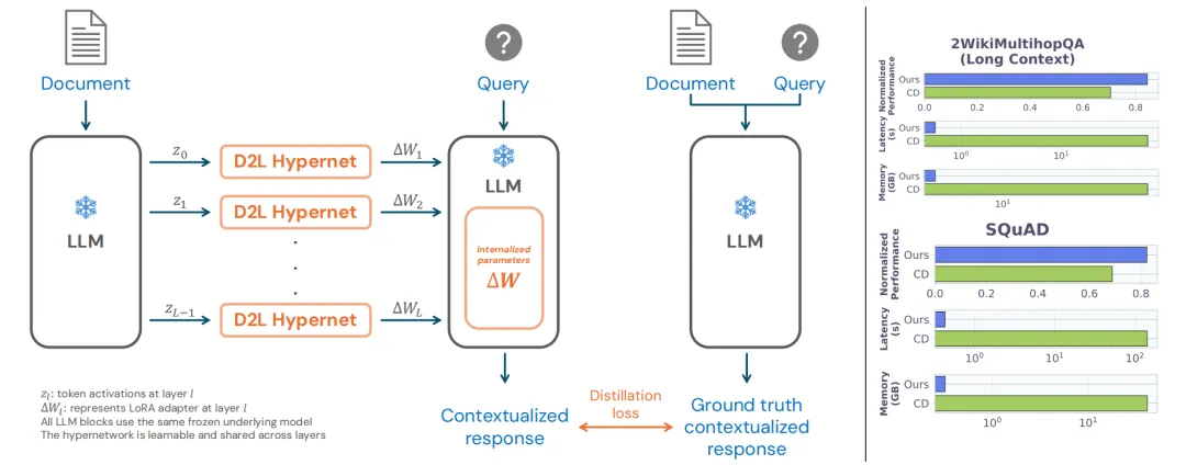 如此一来,模型在最终的推理部署阶段彻底告别了缓慢的梯度反向传播,仅需通过一次极低延迟的单次前向传播,即可动态生成完全适配目标任务或长篇文档的 LoRA 权重。