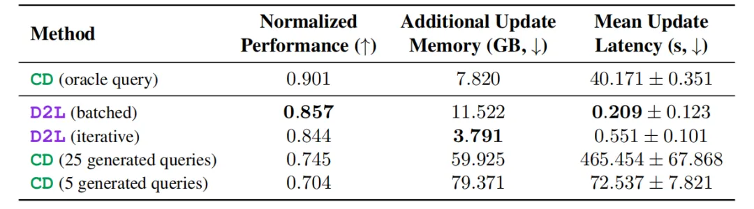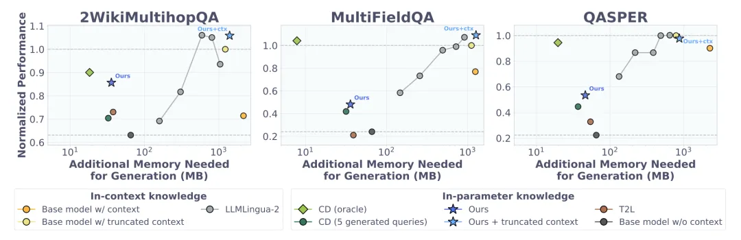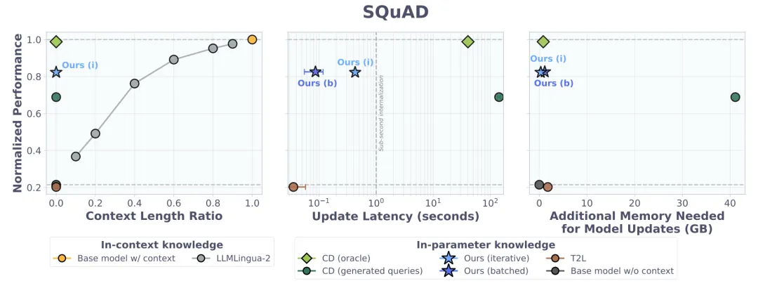 Doc-to-LoRA 论文的量化数据表明,在 2WikiMultihopQA 长文档问答任务中,相比传统上下文蒸馏生成 5 个 Query 所需的高达 79.3GB 的更新期显存,D2L(Iterative)将其大幅压缩至 3.79GB,并实现了亚秒级的更新延迟。