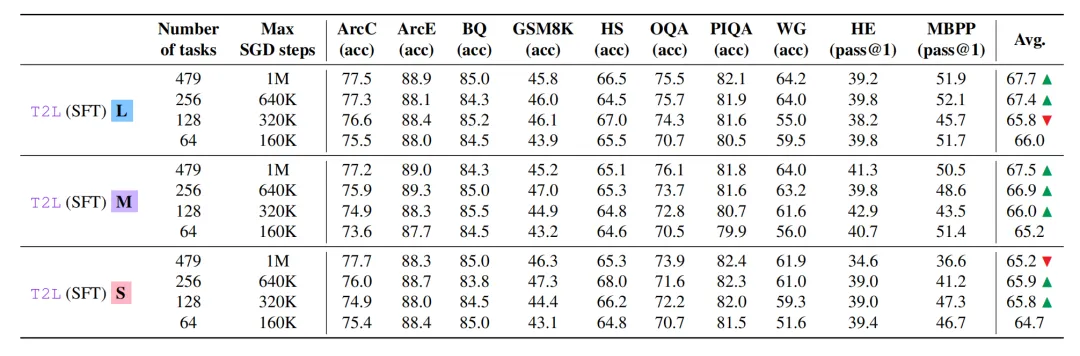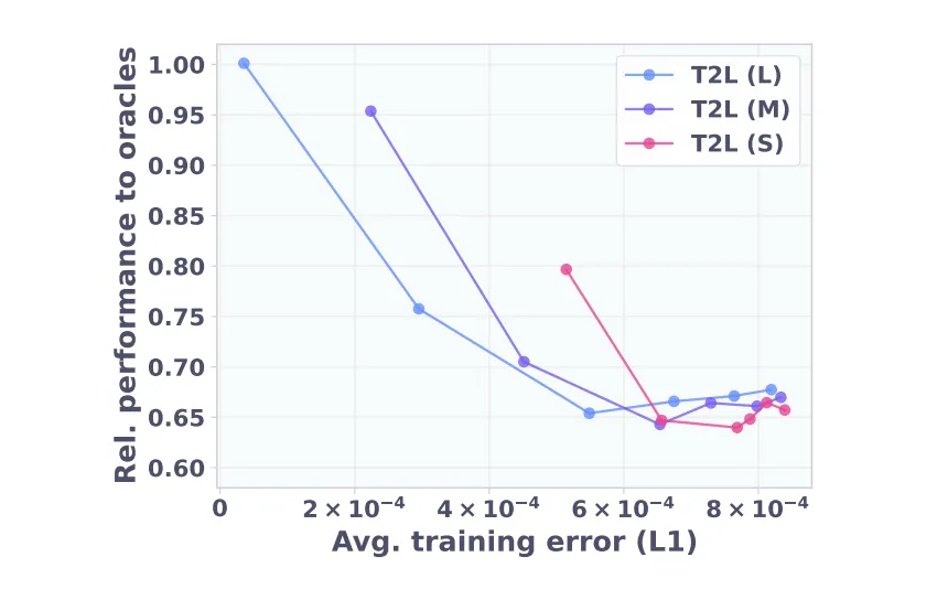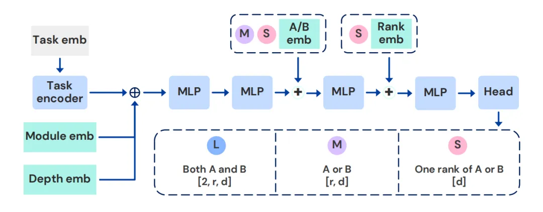 为适配不同的算力预算,Text-to-LoRA 构建了三种复杂度的超网络变体:生成完整 A 与 B 矩阵的大型架构(L)、使用共享特征投影的中型架构(M),以及高度压缩输出头的小型架构(S)。