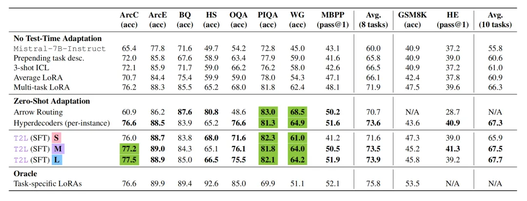 模型在训练中隐式学习了任务簇分布特征。依据论文的核心数据,Text-to-LoRA 在零样本任务自适应性能上以显著优势(均值 67.7 vs 66.3)击败了 Multi-task LoRA 等基线方法。