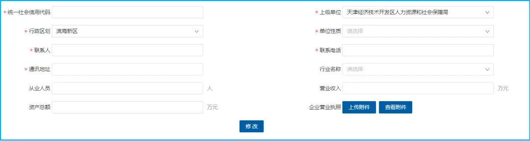对于经开区注册企业,单位基本信息维护处,行政区划选择“滨海新区”,上级单位:天津经济技术开发区人力资源和社会保障局。