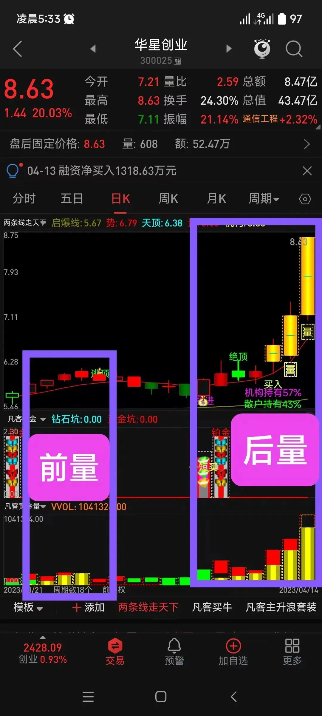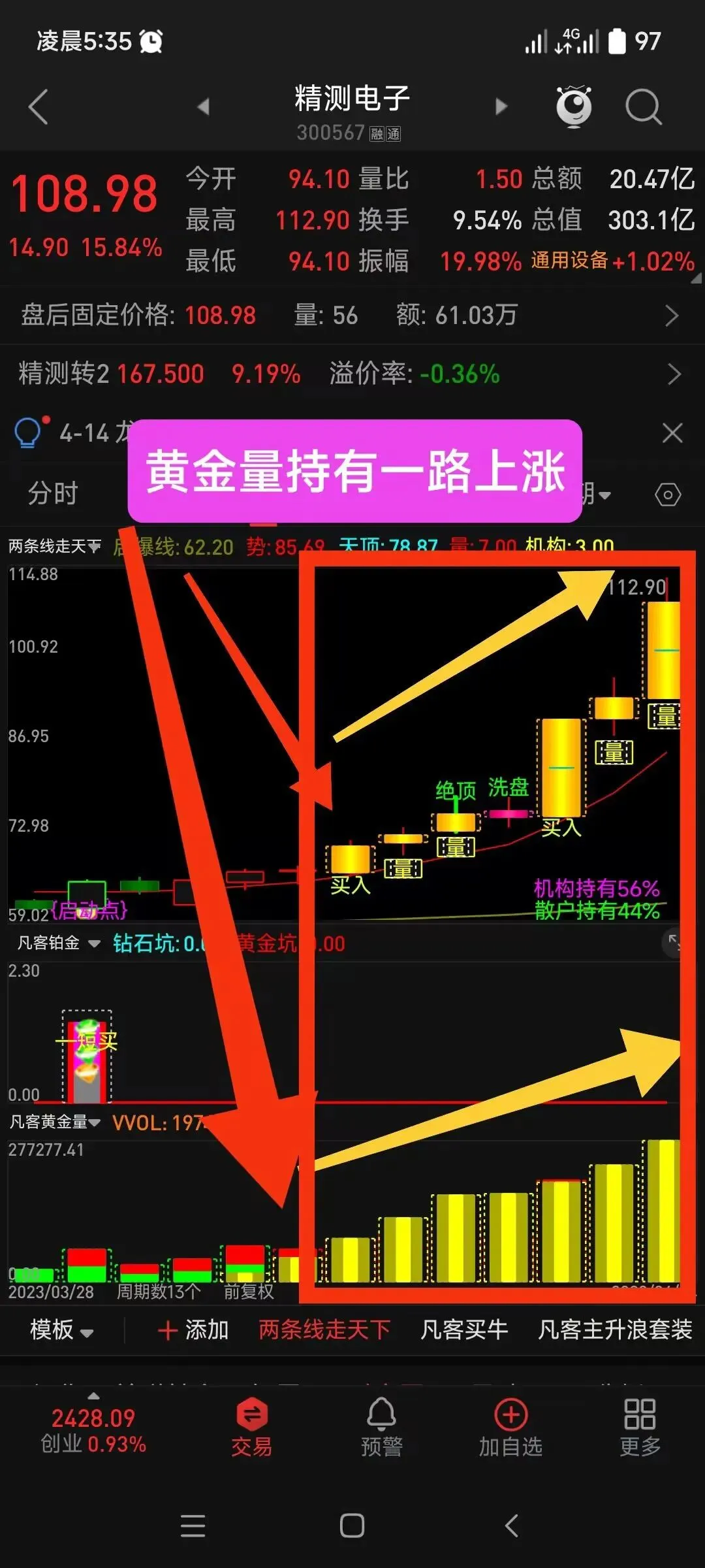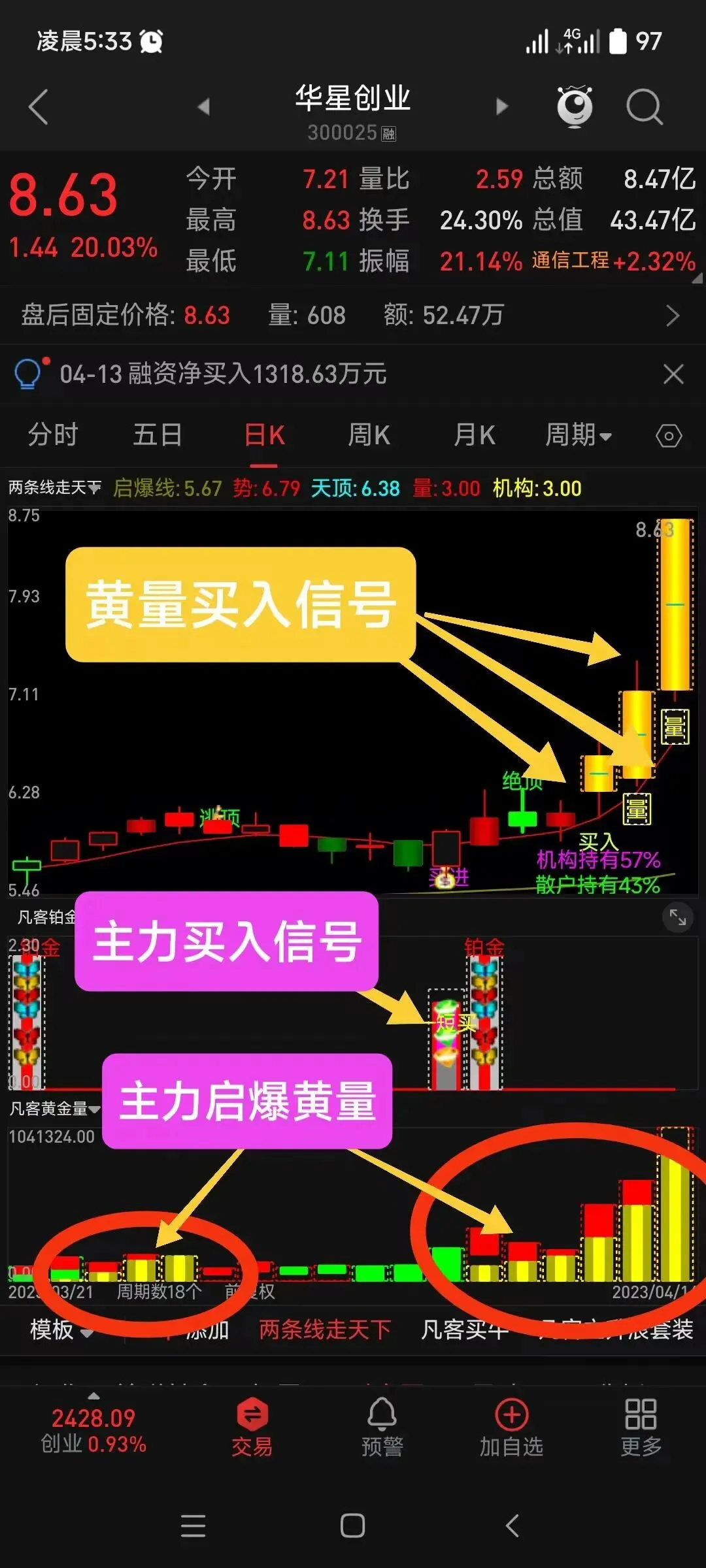 DRAWTEXT(金K线,6,’——爆量分歧’),COLORYELLOW;