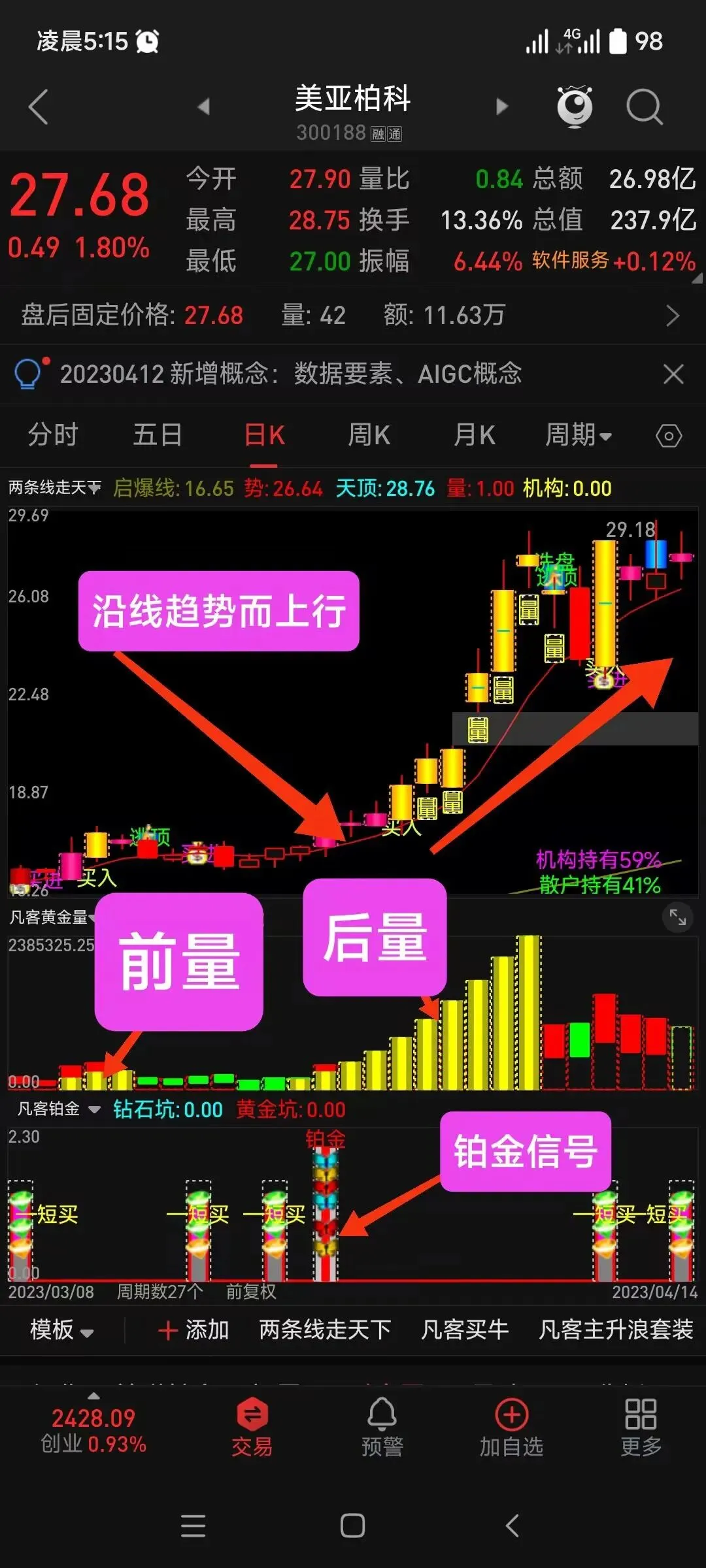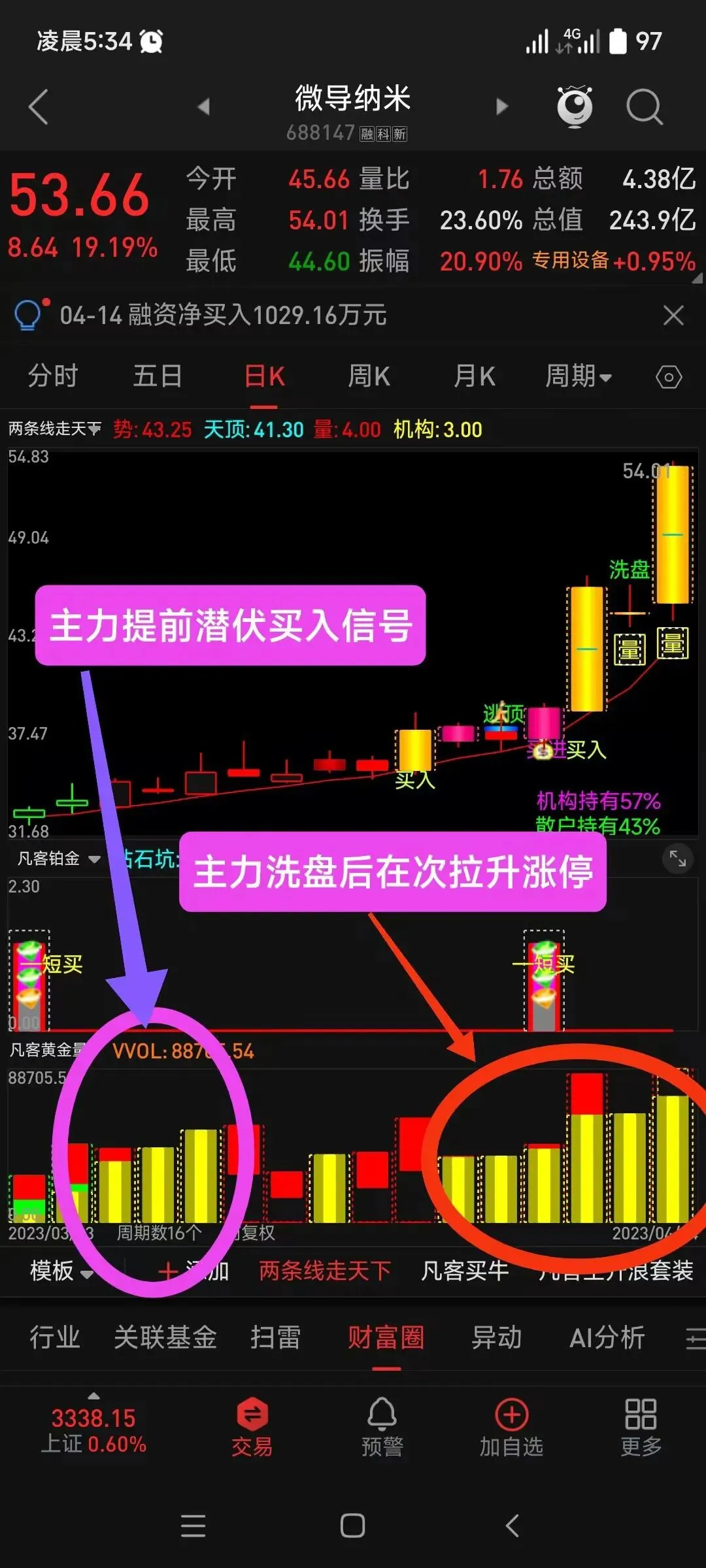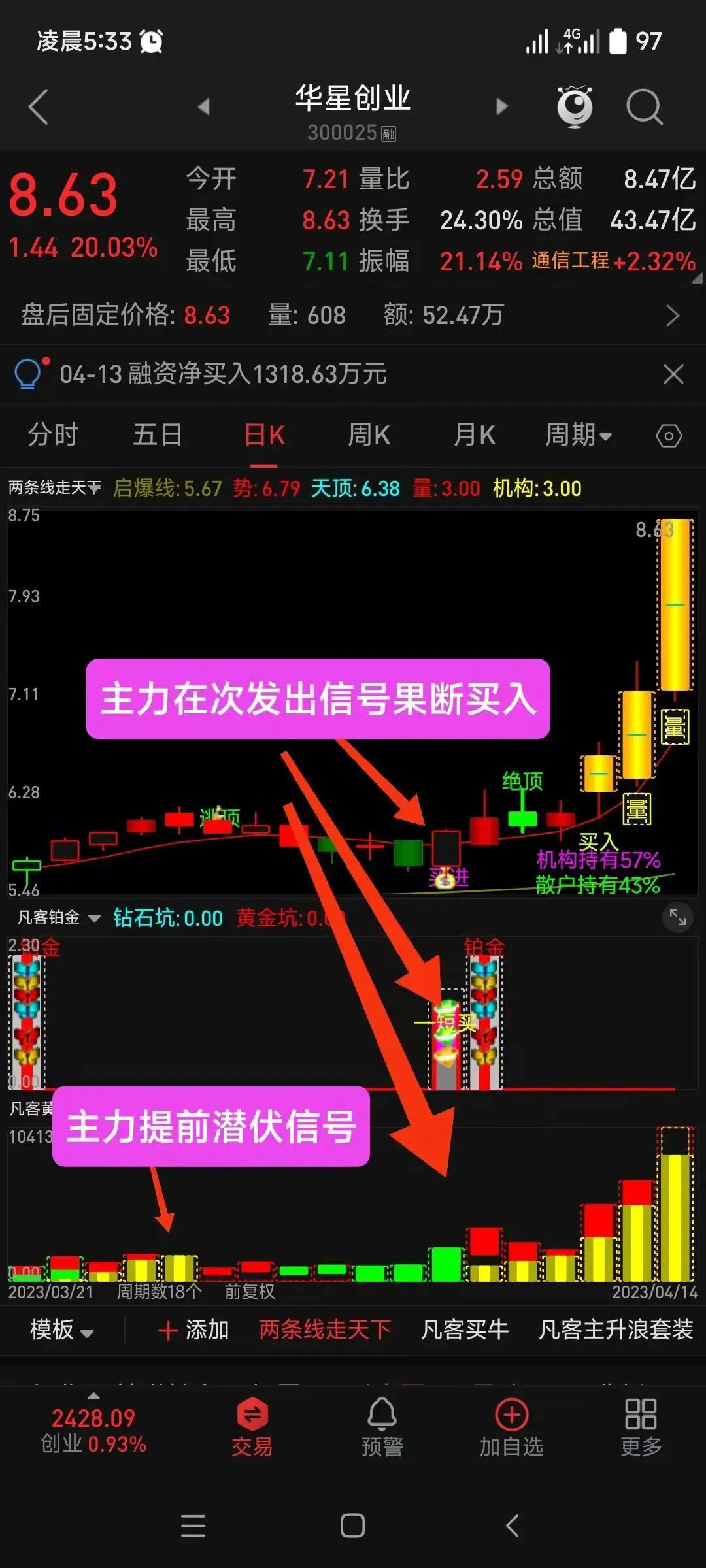 DRAWTEXT(金K线,6,’——爆量分歧’),COLORYELLOW;