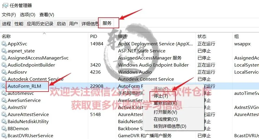16.点击上方的服务,找到AutoForm_RLM右键选择停止;
