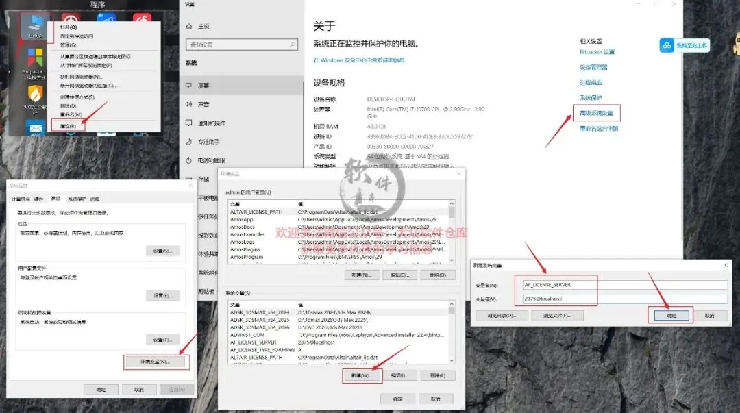 21.右键此电脑选择属性,点击高级系统设置,点击环境变量,依次新建三个系统变量:【AF_LICENSE_SERVER=2375@localhost】【AF_LICENSE_TYPE=F】【AF_LICENSE_TYPE_FORMING=F】;