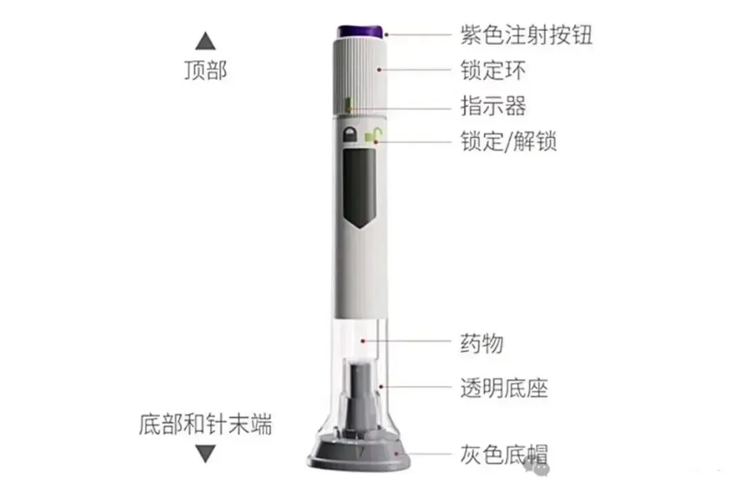 若为自行注射,取下针帽后,将透明底座紧贴皮肤(可选择腹部或大腿),然后按下注射按钮进行给药。若由他人协助注射,也可选择上臂作为注射部位。每次注射时应注意轮换部位,避免在同一位置重复注射。