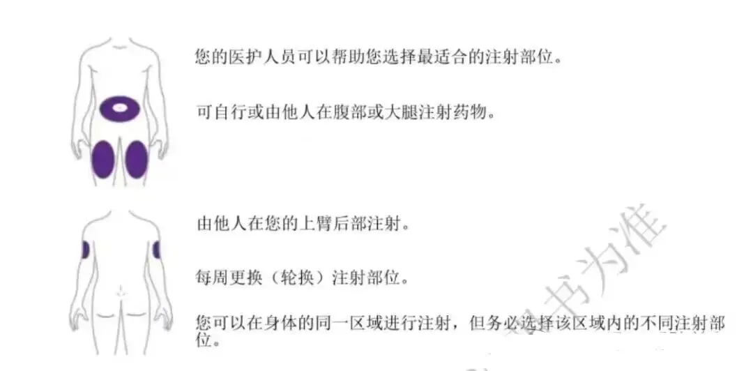 每周一次,皮下住射(可于腹部、大腿或上臂)。时间可选择在一周中的任意一天,但最好固定每周的同一天。