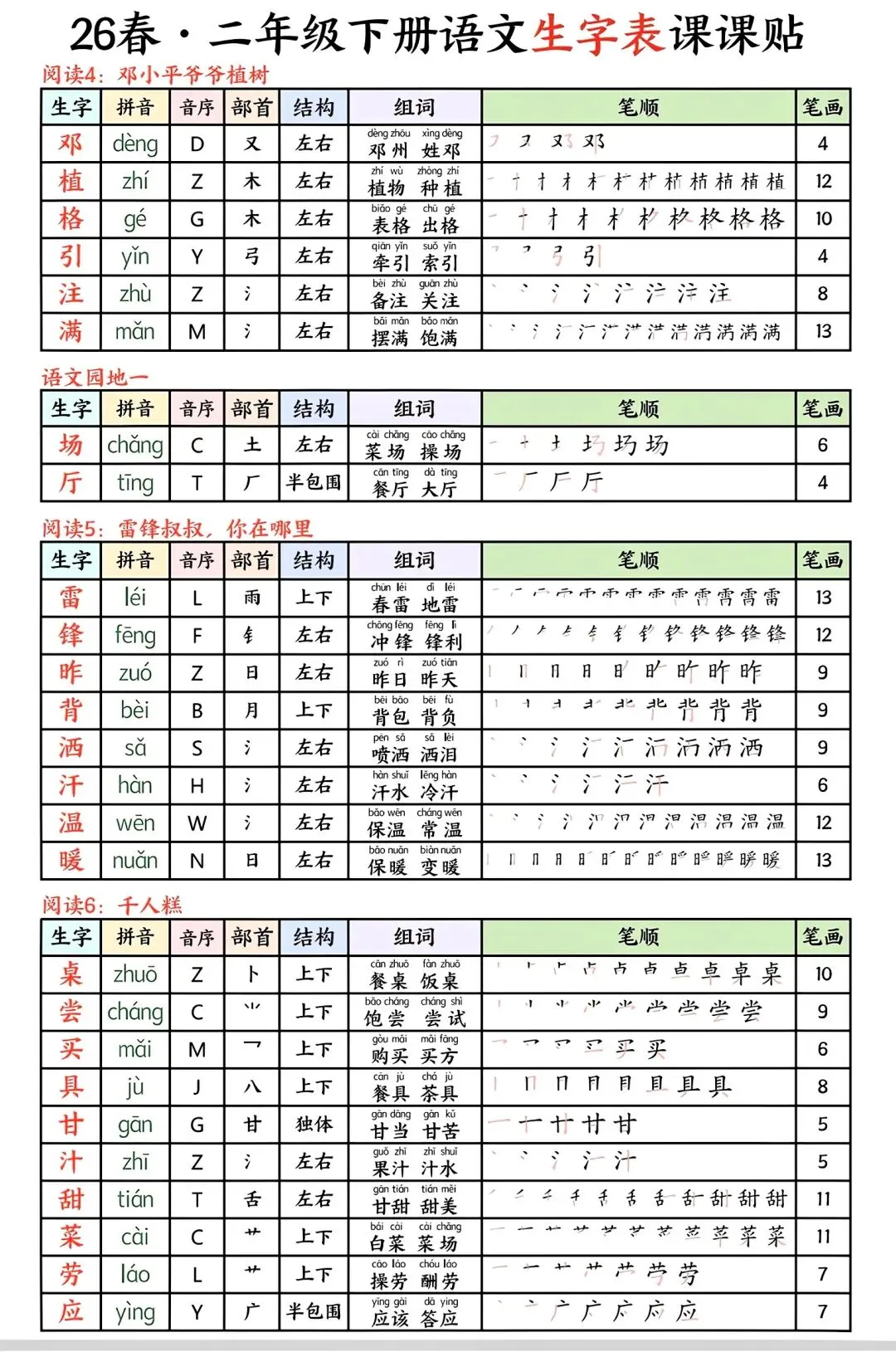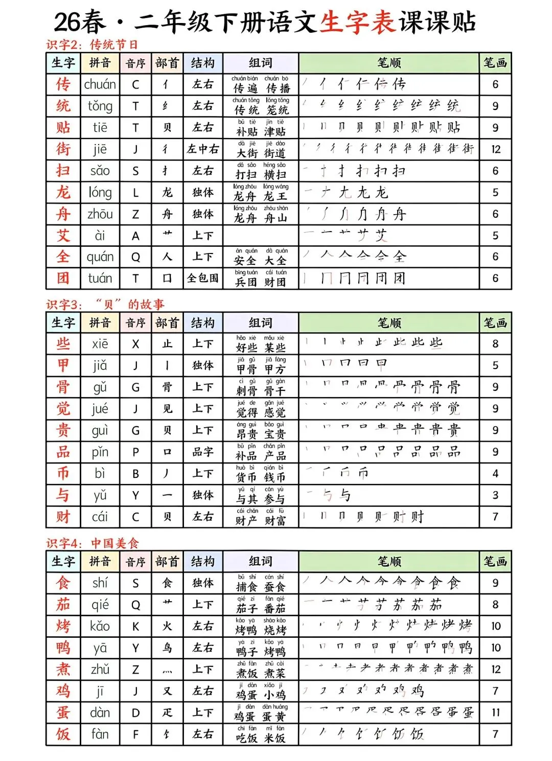 2026春二年级下册语文生字课贴电子版可打印
