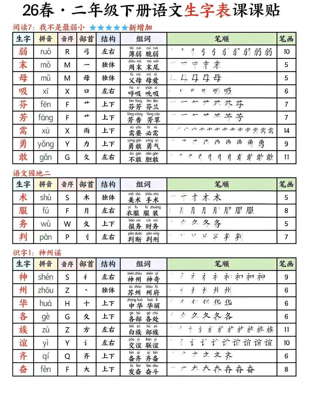 今天给大家整理了部编版二年级下册生字贴,同步课本、带拼音、笔顺、组词,田字格标准排版,直接打印就能用,省心又实用!