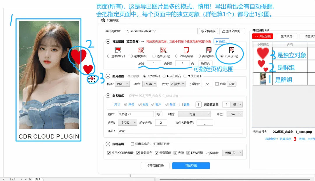 答:对!页面对象多的话,会导出一大堆图。建议先点 生成预览 看看会导多少张。