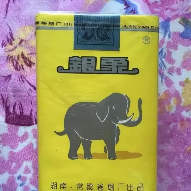 银象烟,壳子黄亮黄亮的,正面画个大象,湖南常德老厂货,烟味有种淡甜,买一包回来全家分着抽,烟盒上油光发亮存几年都不掉色,孩子手上捏着包装袋,看着象头像就觉得稀罕。