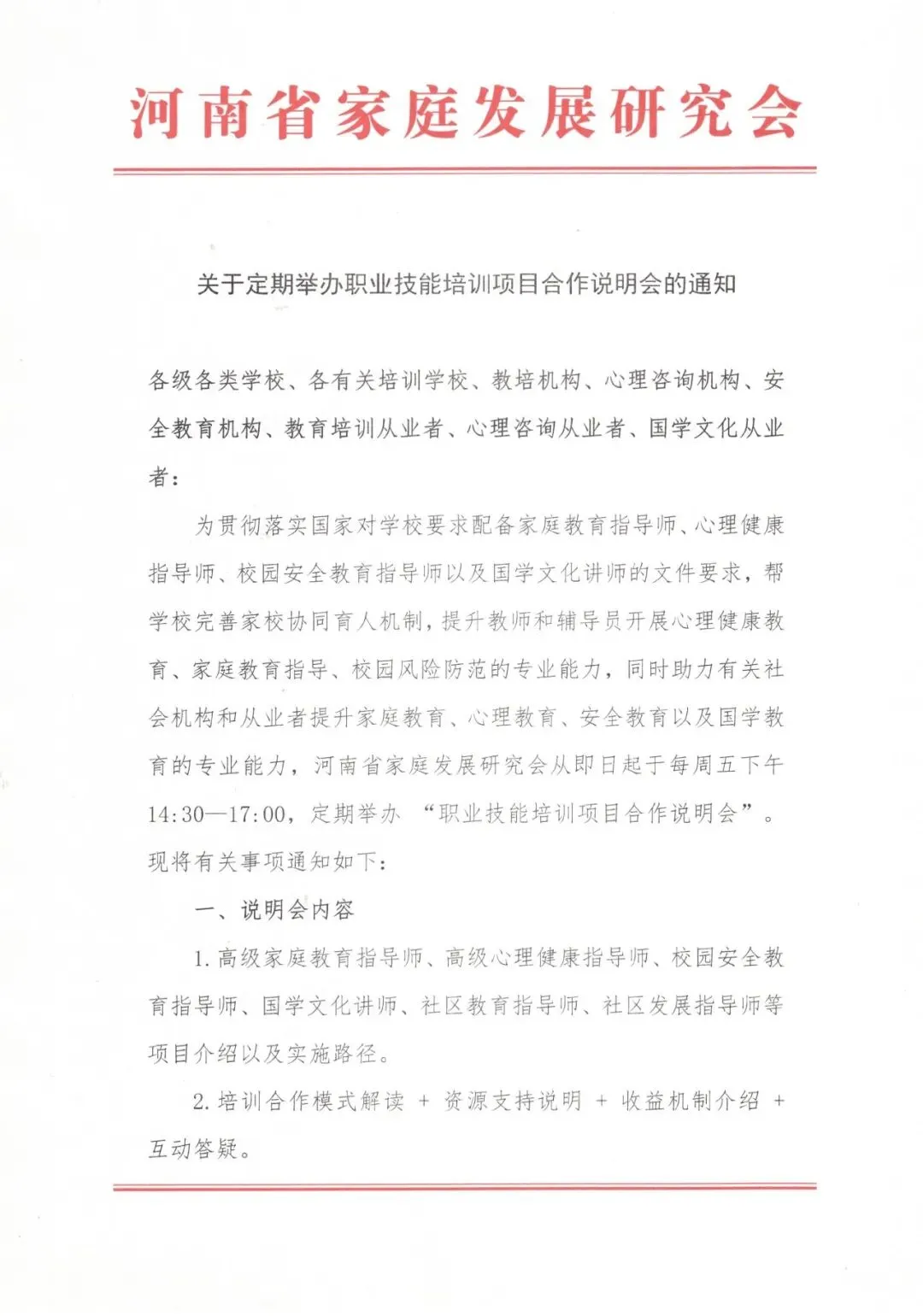 关于定期举办职业技能培训项目合作说明会的通知