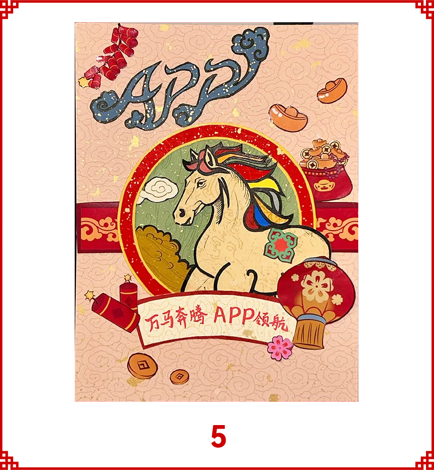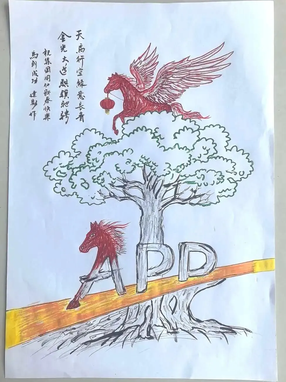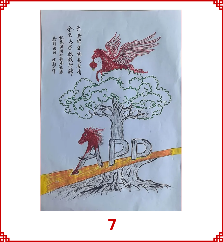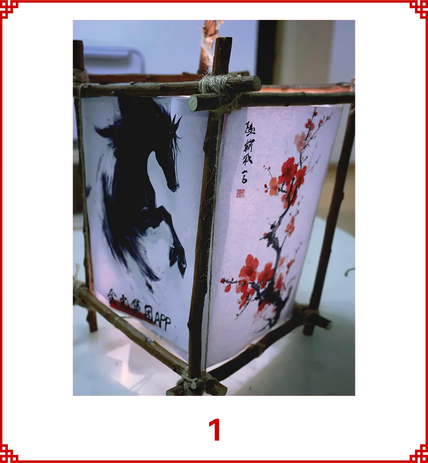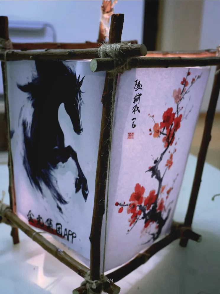 作品使用树枝、四幅画做成一盏灯笼,寓意“春风得意马蹄疾,一日看尽长安花。” 祝愿APP在2026年,乘时代之风,行稳健之路,不仅有快马加鞭的速度,更有老马识途的智慧。愿公司如青松般基业长青,如骏马般驰骋市场。马年里,“纸”因有你,马到成功!