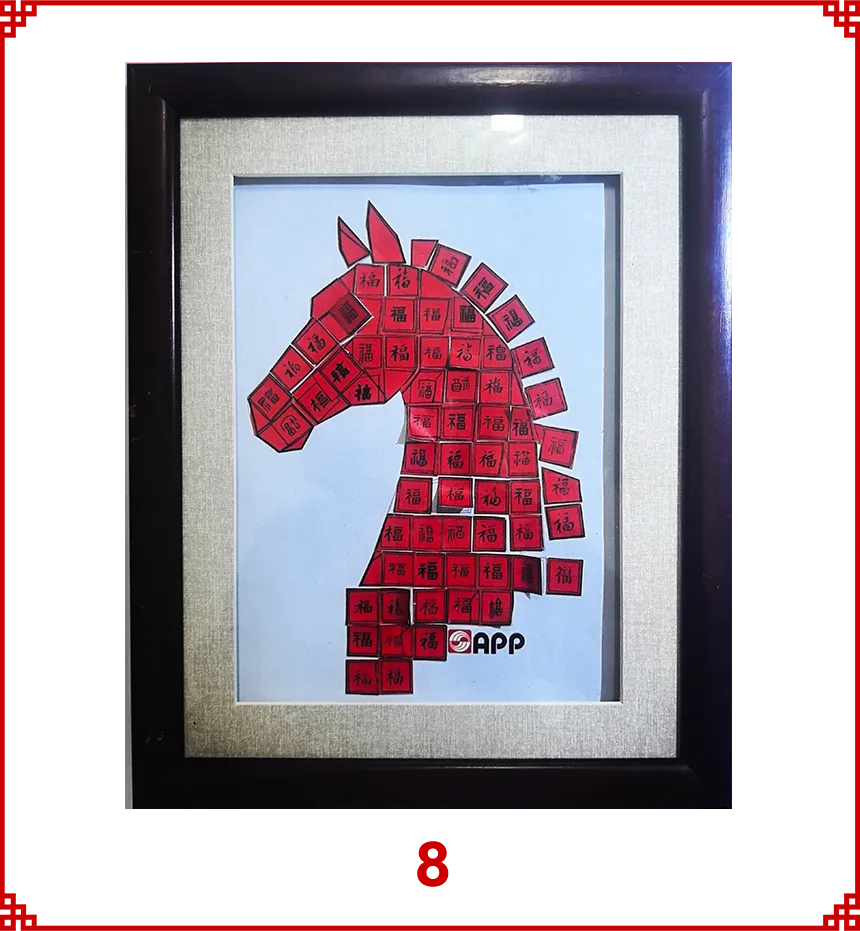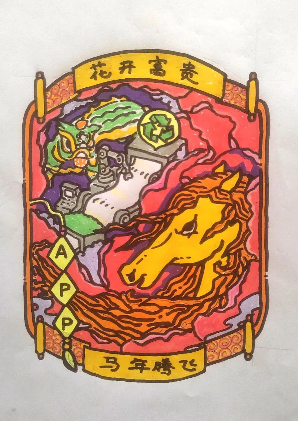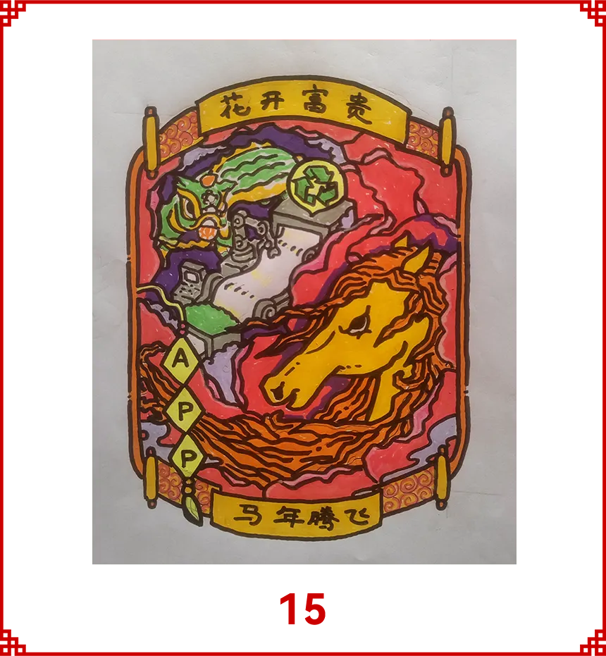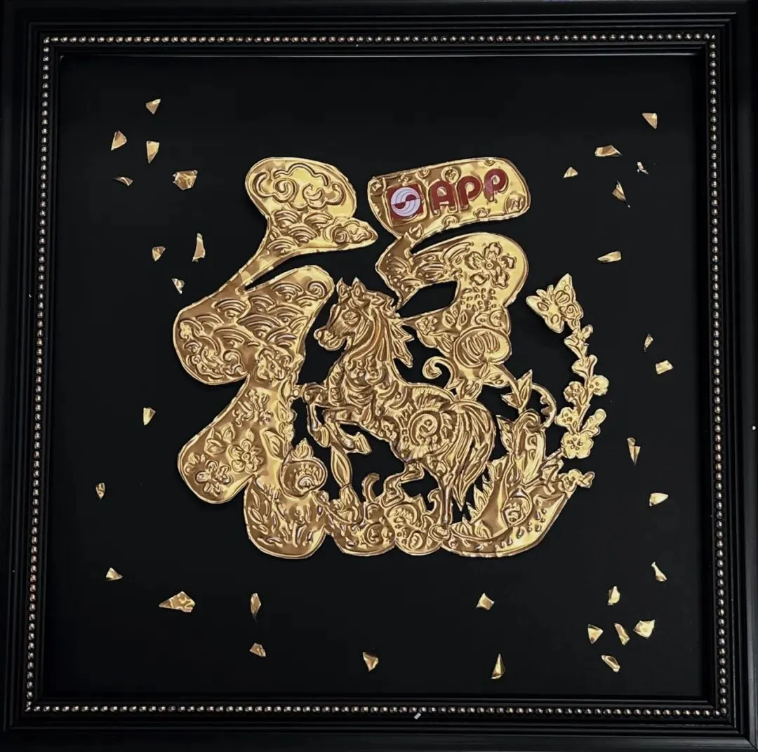 本作品以全剪纸拼贴形式创作,将APP字母化为祥云融入画面,祝APP(中国)如祥云护佑,乘风而上。作品秉承APP(中国)的绿色环保理念,马儿周围的鞭炮、元宝等小元素,均取材于废弃的零食包装盒。 画中骏马蓄势待发,其缤纷的鬃毛由彩色卡纸层层剪贴而成,象征着APP(中国)多元发展的活力与智能工厂的创新光芒。借马年之吉,祝 APP(中国)智领绿色纸业新程,万马奔腾向未来!
