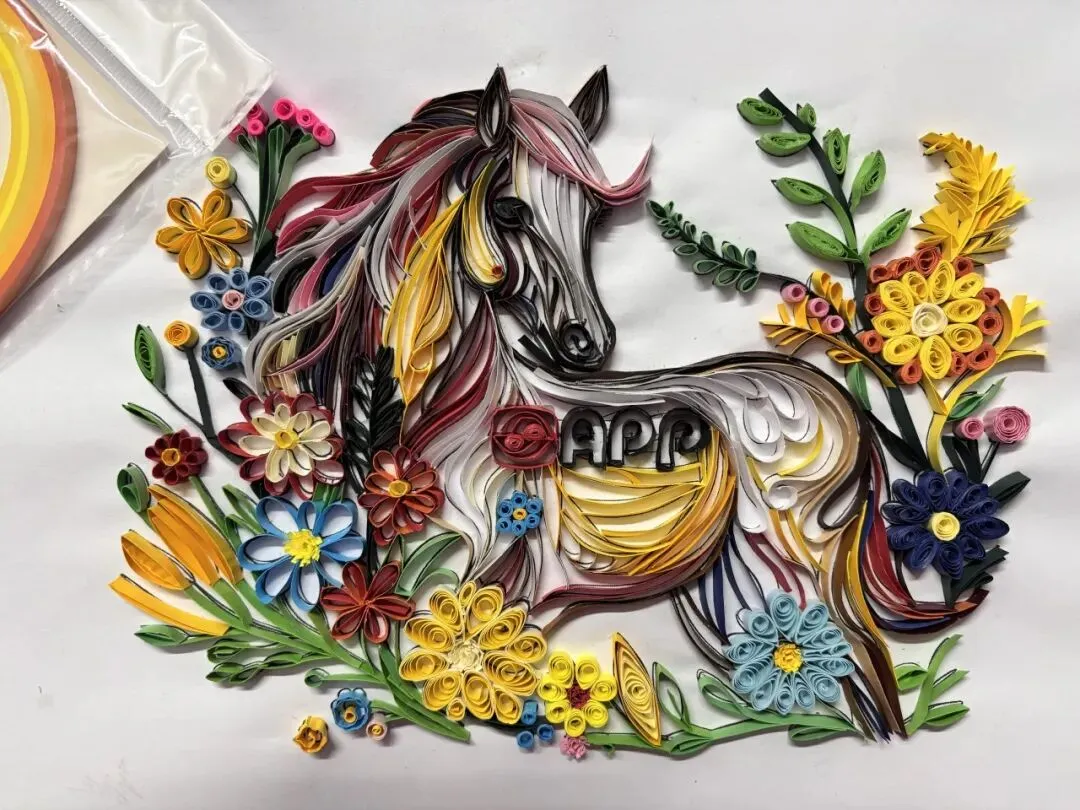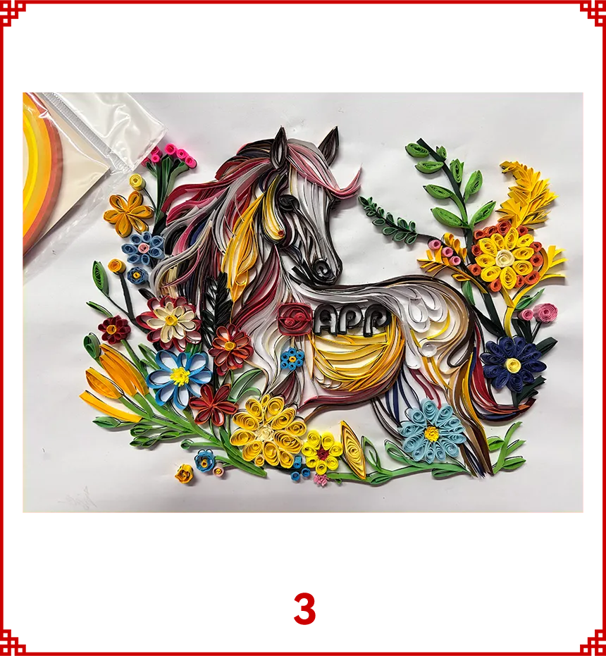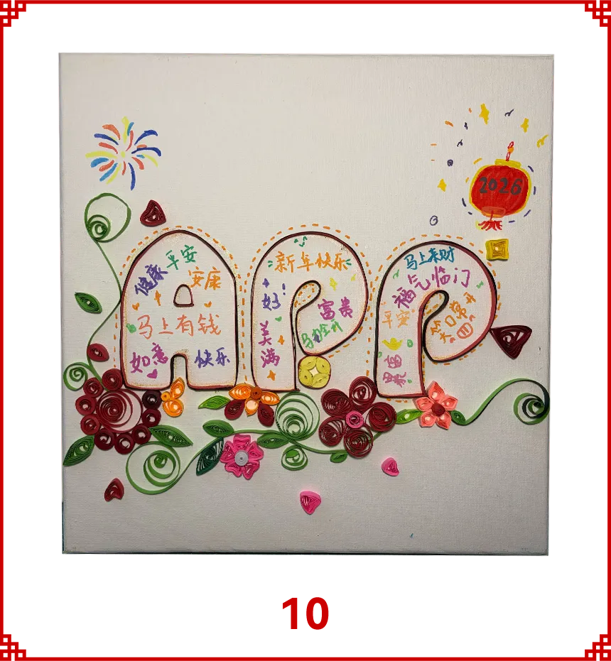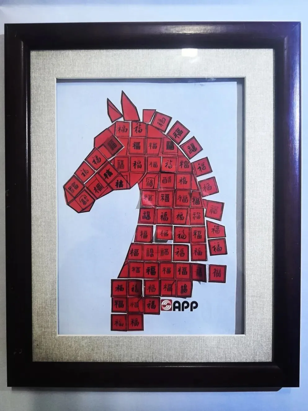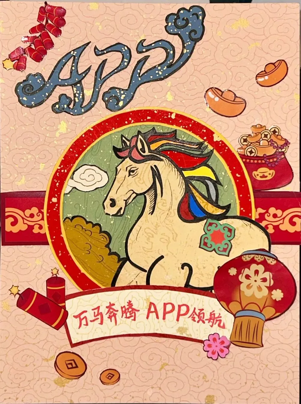 本作品以全剪纸拼贴形式创作,将APP字母化为祥云融入画面,祝APP(中国)如祥云护佑,乘风而上。作品秉承APP(中国)的绿色环保理念,马儿周围的鞭炮、元宝等小元素,均取材于废弃的零食包装盒。 画中骏马蓄势待发,其缤纷的鬃毛由彩色卡纸层层剪贴而成,象征着APP(中国)多元发展的活力与智能工厂的创新光芒。借马年之吉,祝 APP(中国)智领绿色纸业新程,万马奔腾向未来!