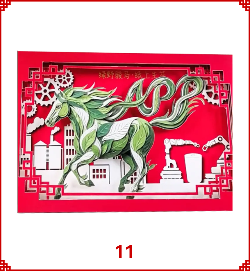 作品以APP三字为核心构思,融入马年元素,传递昂扬向上、积极进取的精神,既体现企业拼搏奋进的发展追求,也彰显乐观向前的生活态度。同时加入醒狮意象,凸显春节喜庆热闹的传统年味,烘托浓厚节日氛围。画面还呈现绿色智能化造纸技术场景,将传统新春元素与现代行业科技感有机结合,既贴合节日语境又展现企业创新与可持续发展追求。