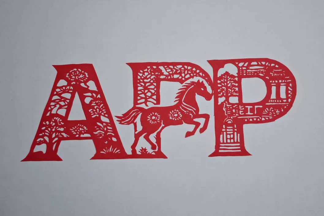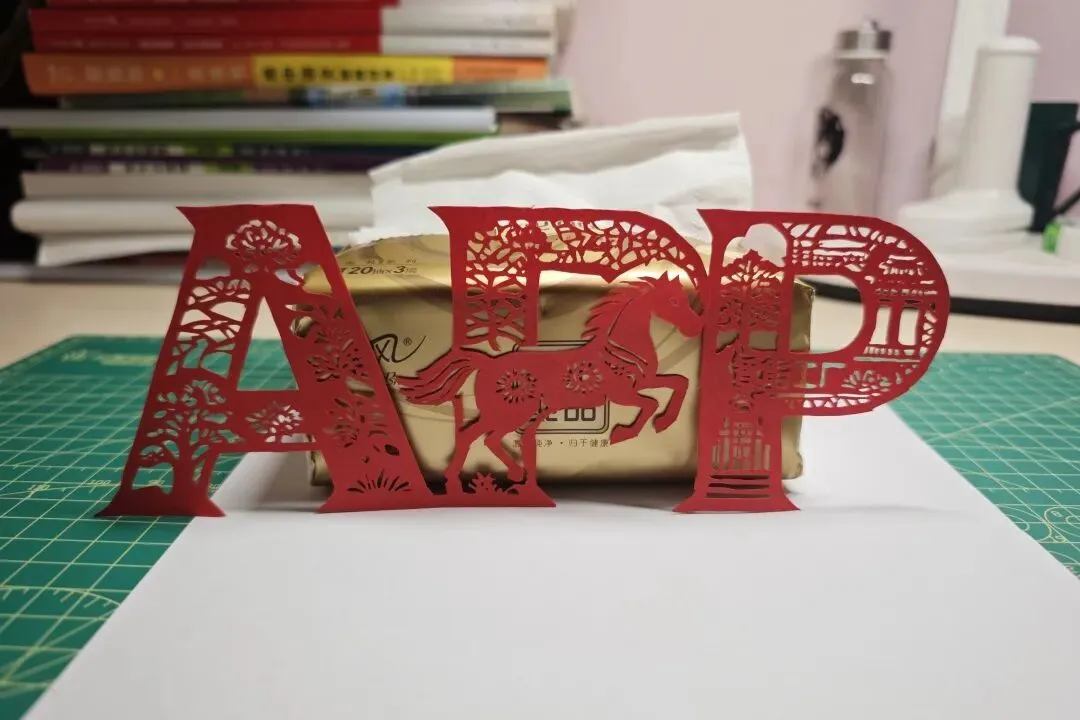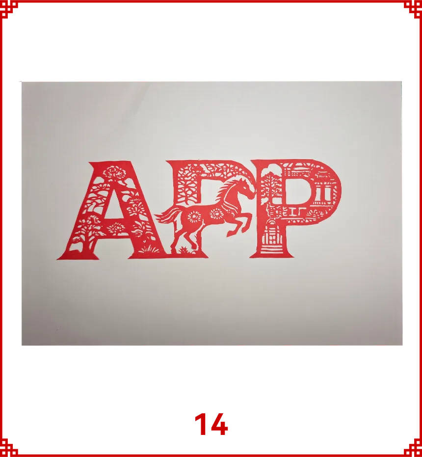 作品以非遗剪纸为骨,以APP字母为形,融合丙午马年吉兆与企业核心价值。字母 “A” 铺陈缠枝牡丹,立东方雅韵之基,中间的“P” 腾跃骏马,寄马到成功之愿,右边的“P” 自上而下绘就“林浆纸一体化”的产业闭环。一纸一乾坤,一马一宏图。作品寓意APP以绿色基业为底,借骏马奔腾之势,智绘服务万家的美好新程。