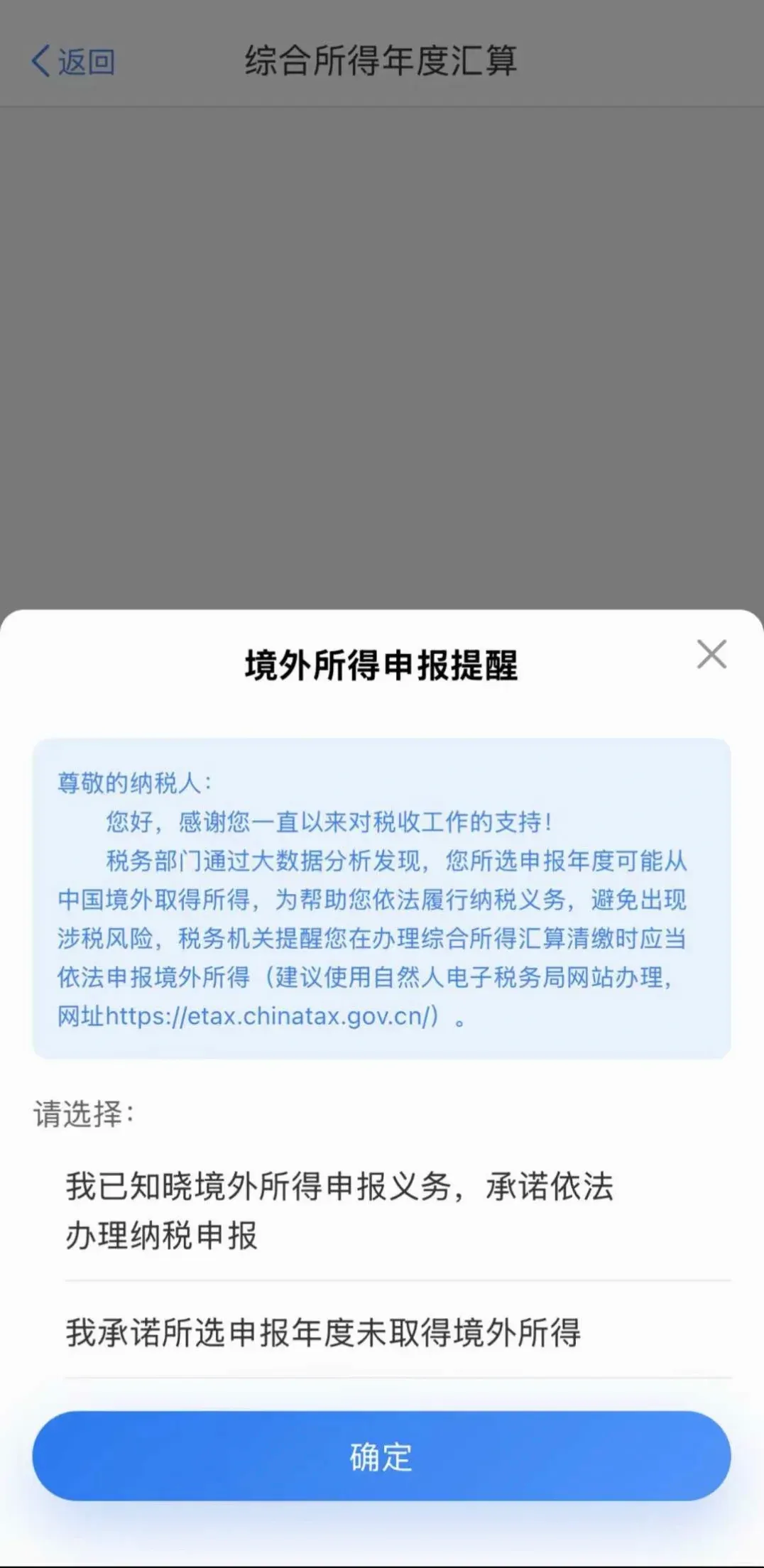 “税务部门通过大数据分析发现,您所选申报年度可能从境外取得所得,为帮助您依法履行纳税义务,避免出现涉税风险。”