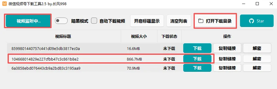 微信视频号视频下载工具,亲测超有效【附下载地址】 软件下载 软件名称:视频号视频下载工工具 网盘下载地址: https://pan.quark.cn/s/00f8ae9b7f98 或者扫下方二维码获取 注:本公众号提供下载的所有内容,均由互联网收集整理所得。仅供学习交流使用,请勿用于商业用途。 使用教程: 1、按上述链接下载,然后进行解压 2、双击“微信视频号下载工具2.5”启动工具 3、下载前,先点击【开始监听】,然后打开视频号的视频进行播放,这时候,工具就会显示,点击下载,下载完后,点击打开下载目录,就能找到要下载的视频。 此工具小编亲测有效。