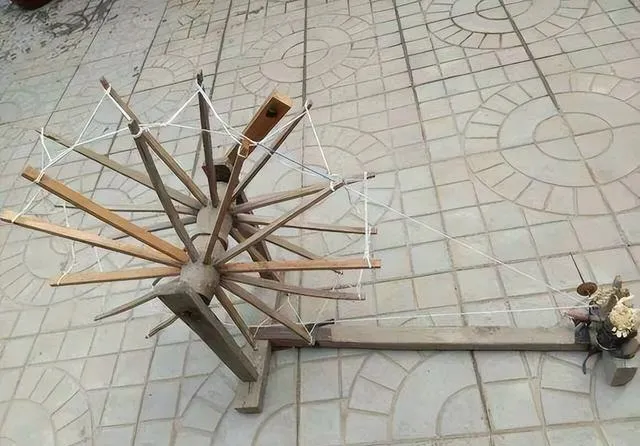 图中就这大家伙叫手摇纺车,全部木头做成,三角支架,满身棱角划手,一根长长的杆子连着轮子,线缠得密密把把的,老家屋里有时候就支一架,半夜还能听见嗡嗡的响,我妈以前一边搅棉花一边叨叨手快冻僵了,小时候我还跟着转过两圈,打不出精细线,全给带断了,真是没那手艺就白瞎这东西。