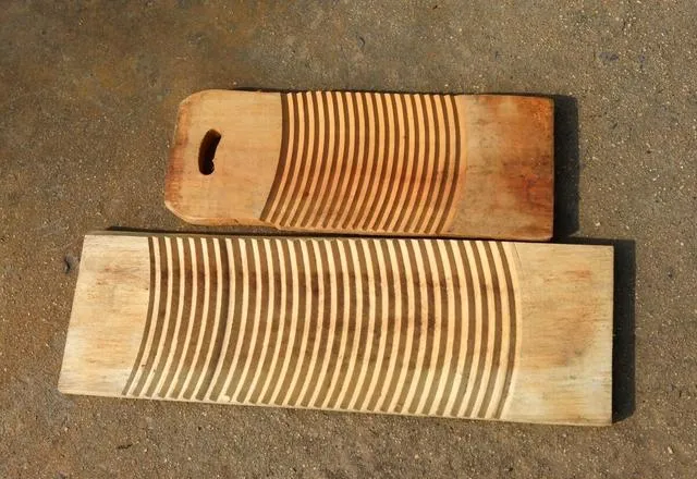 图上两块板子就是搓衣板,条纹一深一浅,洗衣服的主角,家家都备着,小时候衣服脏得厉害,端着搓衣板趁太阳好下河沟一泡,我袖子挽一半,跟在大人身边照葫芦画瓢,搓半天满手是泡,家里洗衣机多了以后,搓衣板才慢慢靠边站,偶尔有手洗也就顺手抓起用用。