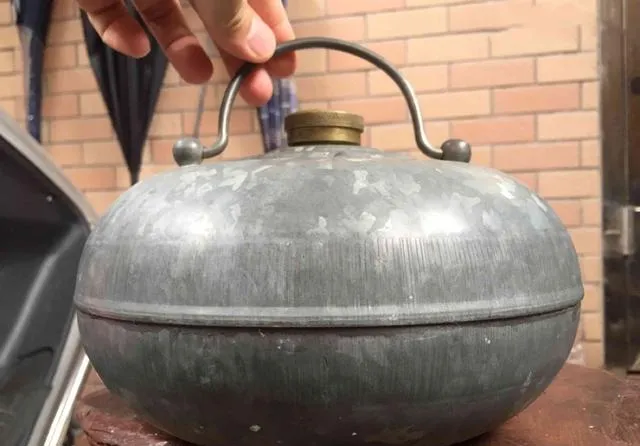 手里提着的这个圆罐叫汤婆子,金属铁皮或者铜质的,一壶热水灌进肚,睡前塞到被窝底,脚丫子一搁上去烫手又踏实,冬天的夜,没这个真下不了床,小时候我记得有时还兴一边踢它一边跟妹妹斗嘴,妈妈总说别把汤婆子踢漏了,一漏一宿都凉,真是日常老物件里最顶用的一个。