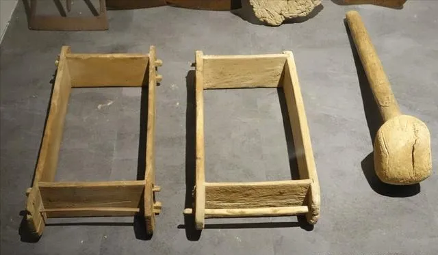 这一排木头家伙叫砖坯模子,备战备荒那年代,家家分配任务造砖,泥浆一倒进去用脚压实,左邻右舍全家上阵,赶进度的时候小孩也都上手,做完晾干堆在场院,居委会一收旧砖全砌进防空洞,有的人家模子还借来借去轮着用,这是那年代实打实的集体记忆。