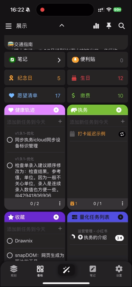 5. 支持自定义设置页的“执务”部分,支持调整顺序;支持更丰富的入口,如笔记、习惯养成、便利贴、收集箱、量化任务、废弃任务和置顶任务