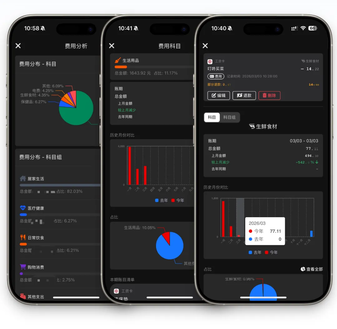 2. 点击账目可查看账目详情,包括同类型科目、科目组的当年、去年各月的金额柱状图