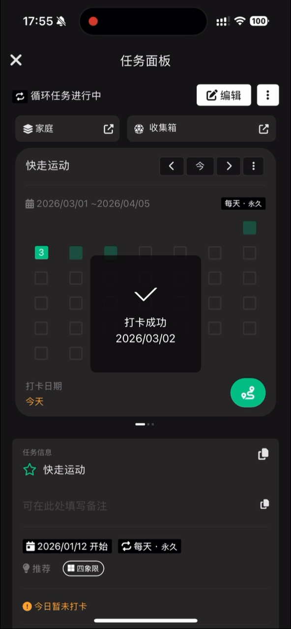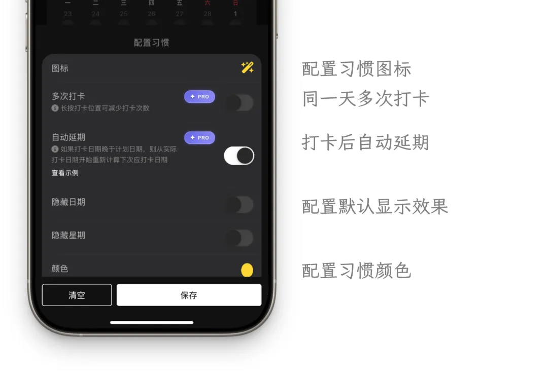 6. 习惯打卡支持顺延功能(执务 Pro)。如果用户打卡推迟,允许下一次打卡时间按推迟后的时间来计算