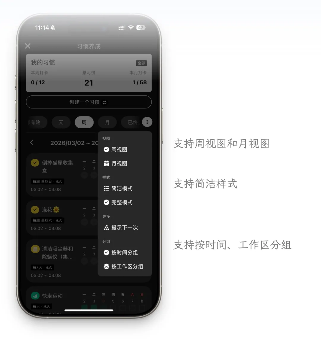 7. 优化习惯养成页面,可按工作区、时间进行分组,可指定显示样式(周视图、月视图,简洁模式、完整模式等)