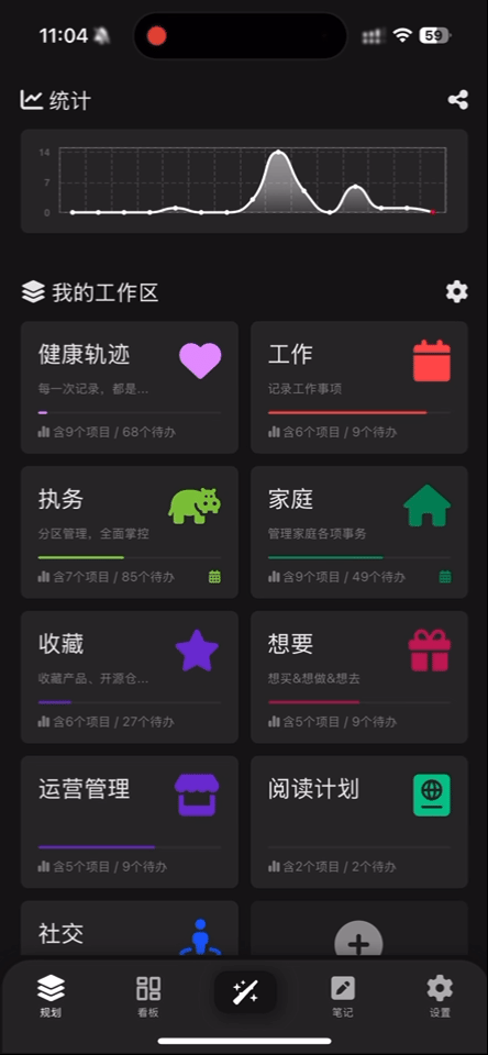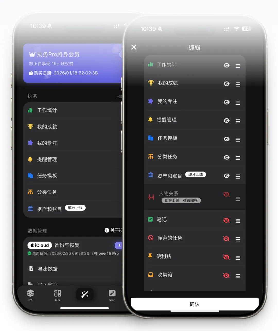 5. 支持自定义设置页的“执务”部分,支持调整顺序;支持更丰富的入口,如笔记、习惯养成、便利贴、收集箱、量化任务、废弃任务和置顶任务