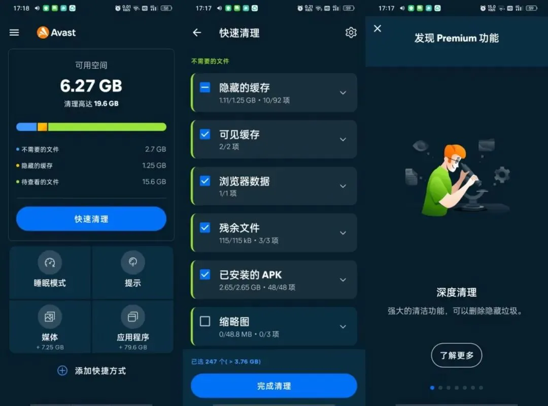 **简介:** Avast Cleanup是一款专业的系统清理工具,可清理缓存文件、临时文件、浏览器历史记录等垃圾数据。支持应用休眠功能提升性能、延长电池寿命,自动扫描重复照片和臃肿软件,释放存储空间。