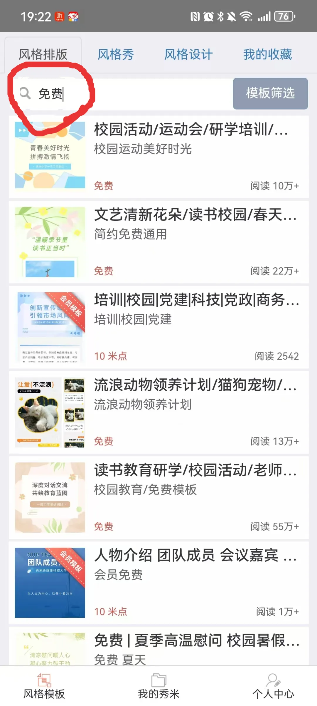 2. 筛选:顶部勾选 免费;可按行业/风格/节日搜索(如“教育/简约/开学”)