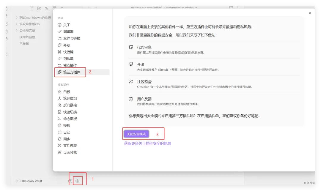 3.左下角的设置——第三方插件——关闭安全模式(才能安装插件)