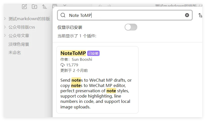 5.搜索“Note ToMP” 点进去之后有个安装按钮,点击安装即可。