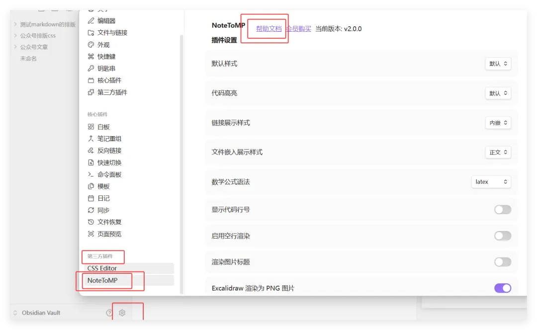 6.再次点开Obsidian的左下角设置,查看第三方插件,点“Note ToMP” 进来可以看上方有帮助文档(Note ToMP插件使用教程)