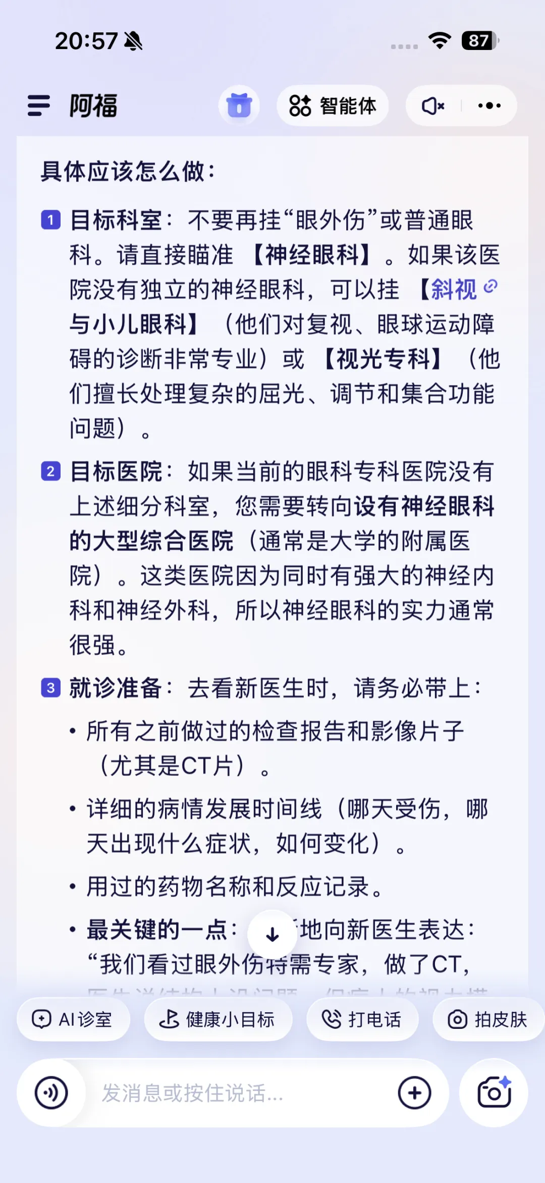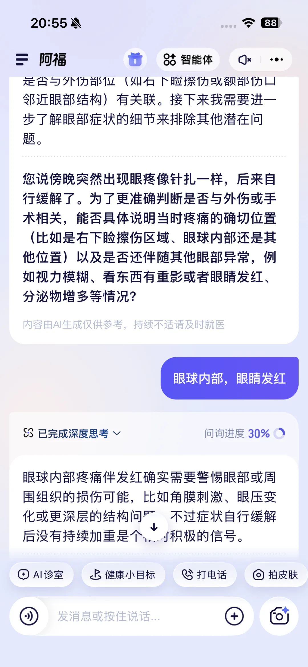 举个例子,在头部受伤后的几天,我爸出现了眼睛短暂性刺痛的情况,而当时又刚好赶上春节放假,住院部只有护士值班,在着急的情况下我就可以把全部事情和症状描述给它,它也会持续追问:具体是哪种疼法,什么时候疼痛会加剧等等。