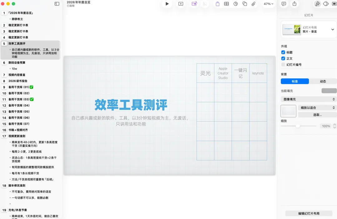 之所以用keynote来做,除了它界面简洁颜值高之外,还有一点就是可以随意插入新的内容页面,经过一年的积累,把一份年计划变成密密麻麻的年总结。