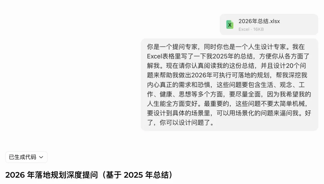 我做年计划的时候,会让AI扮演人生设计师,对我提出20个个性化问题来探索我的恐惧和热爱,逼自己直面现实。