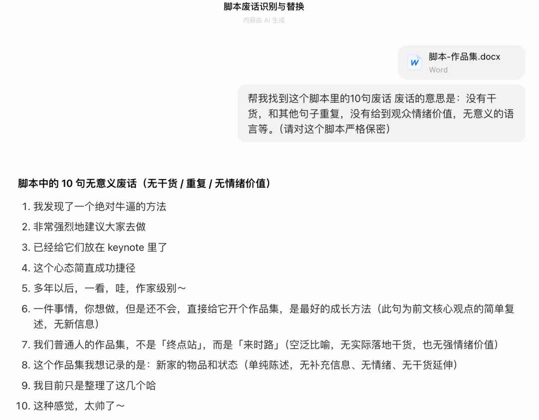 我写完每一个脚本,都会把它发给AI,让AI给我的脚本打分,然后自己去修改那些没得分的地方。以及,我怕自己当局者迷,还会让AI给我挑出我脚本中意思重复、没有信息增量、大家无法理解的10句话。