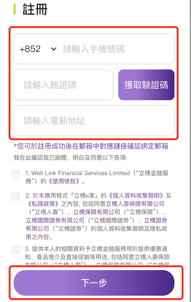 输入”手机号码”、”验证码”、”电邮地址”后点击”下一步”