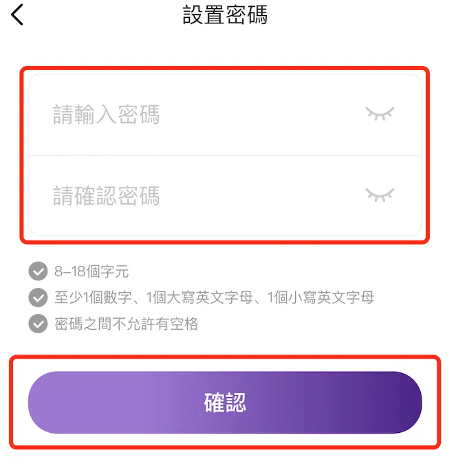 根据页面提示设置8-18位密码,”确认”后,即注册成功