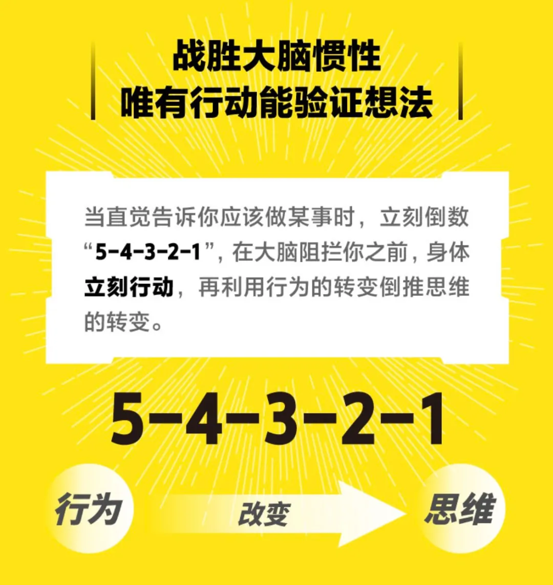 我尝试了一个有效的做法:想刷的时候,这时候给自己5秒,5-4-3-2-1——干,直接切换到下一个行动,这就是《纽约时报》畅销书作家梅尔·罗宾斯的《5秒法则》,用行为改变思维。5秒法则倒计时,能够打破人们的思维定式,制造“发起仪式”,激活大脑的前额叶皮质,从直觉告诉你要采取行动到大脑阻止你行动,中间有个5秒的时间差。5秒后各种借口和理由都会阻止你行动,而采用5秒法则,正是屏蔽感受、直接行动,并让行动倒退思维的转变。