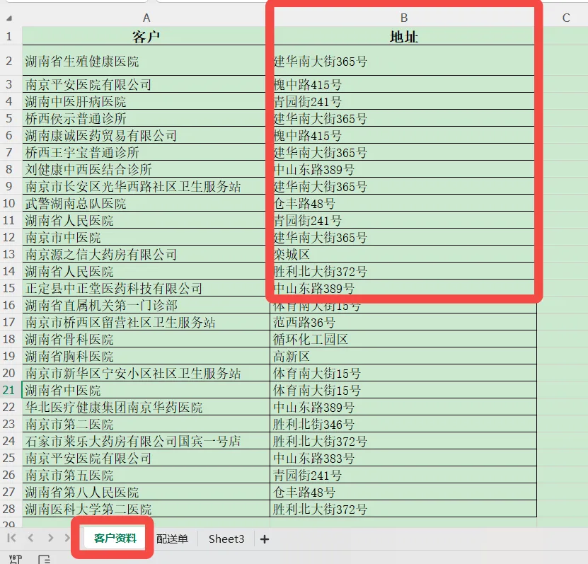 操作:1.在客户资料sheet表里增加送货地址列,并将地址都维护好。后期如有新增或者变动的,都可以直接在这里修改,其他的地方不需要动。