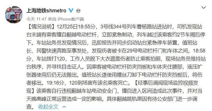 12月25日18:55分,3号线344号列车曹杨路站进站时,司机发现站台末端有乘客擅自翻越电动栏杆,立即紧急制动,列车越过该乘客约2节车厢后停下。车站站务员发现情况后,迅即报告并同步启动站台紧急停车装置,值班站长、民警快速奔跑至事发处,发现伤者被卡在29号电动栏杆门和车体之间。18:58分,车站拨打120,工作人员脱下大衣遮盖伤者防止乘客拍照,现场站务员维持站台秩序,并寻找目击证人。因乘客被电动栏杆防夹挡板和车体夹住腰部,液压扩张器使用后仍无法搬出。值班站长遂使用螺丝刀卸下电动栏杆防夹挡板后,将伤者移出。19:16分,120到场宣布该名乘客死亡。